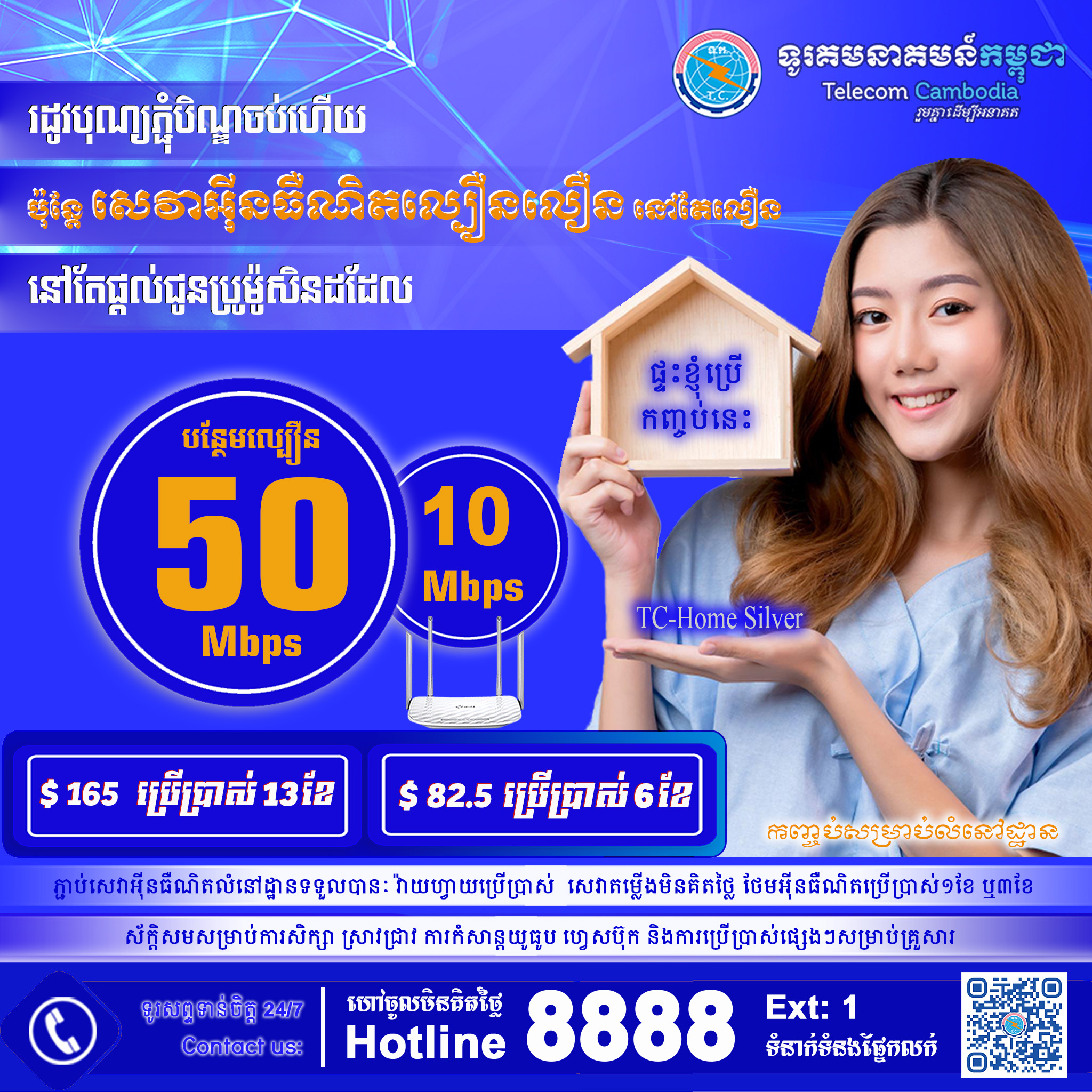រដូវបុណ្យភ្ជុំបិណ្ឌ បានចប់ហើយ !!! ប៉ុន្តែសេវាអ៊ីនធឺណិតល្បឿនលឿន ភ្ជាប់តាមបណ្តាញកាបអុបទិក សម្រាប់គេហដ្ឋាន នៅតែបន្តផ្តល់ជូន បន្ថែមចំណុះល្បឿនដោយមិនគិតថ្លៃសម្រាប់កំសាន្ត និងប្រើប្រាស់តាមតម្រូវការ ថែមជូន១ខែ ដល់ ៣ខែ ប្រើប្រាស់ដោយមិនគិតថ្លៃ សេវាដំឡើង និងផ្តល់ជូនវ៉ាយហ្វាយប្រើប្រាស់ ដោយមិនគិតថ្លៃ មិនតម្រូវបង់ប្រាក់កក់សម្រាប់ការប្រើប្រាស់ បម្រើសេវាជូន២៤/៧ សម្រាប់ការទាក់ទងមកលេខទូរសព្ទទាន់ចិត្ត ហតឡាញ ៨៨៨៨